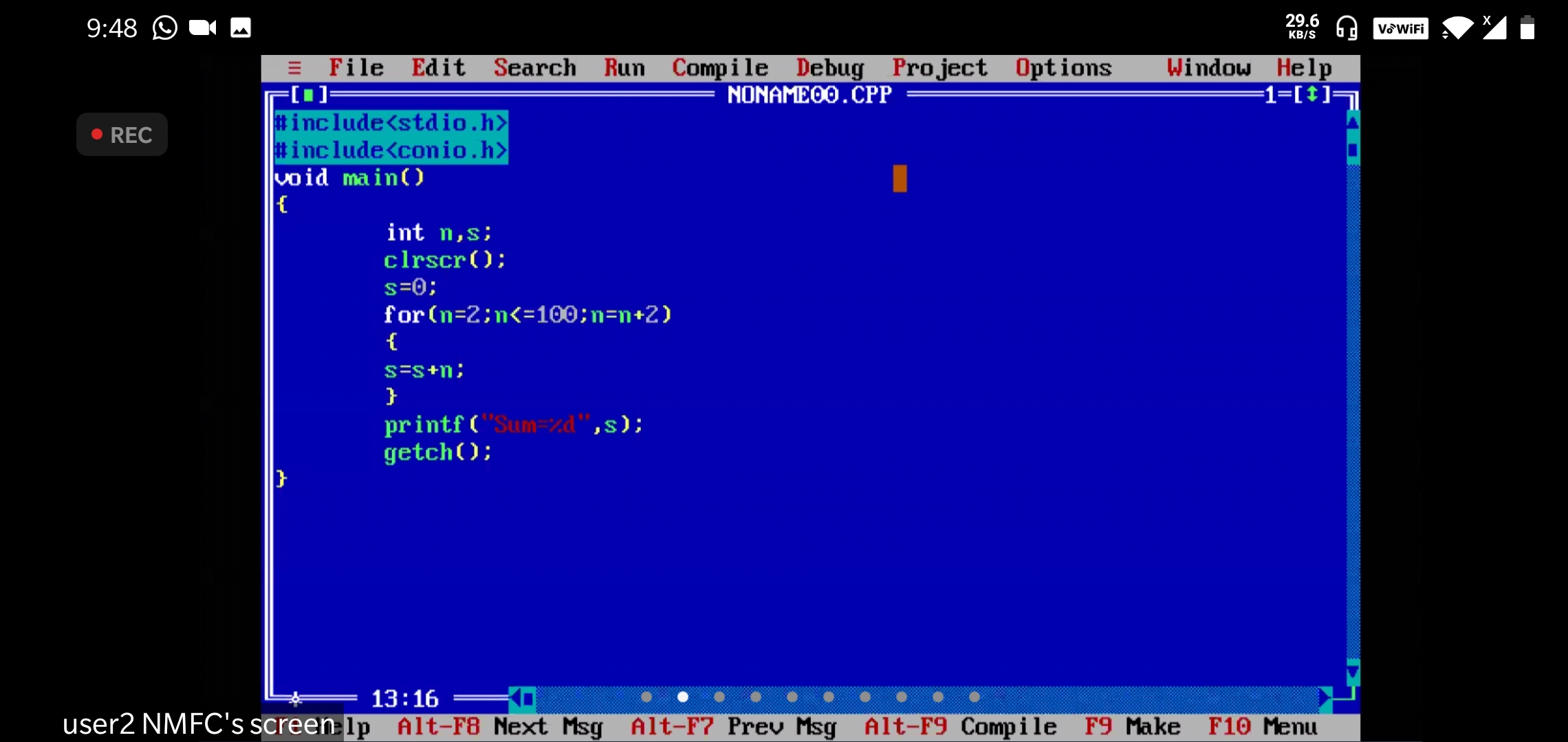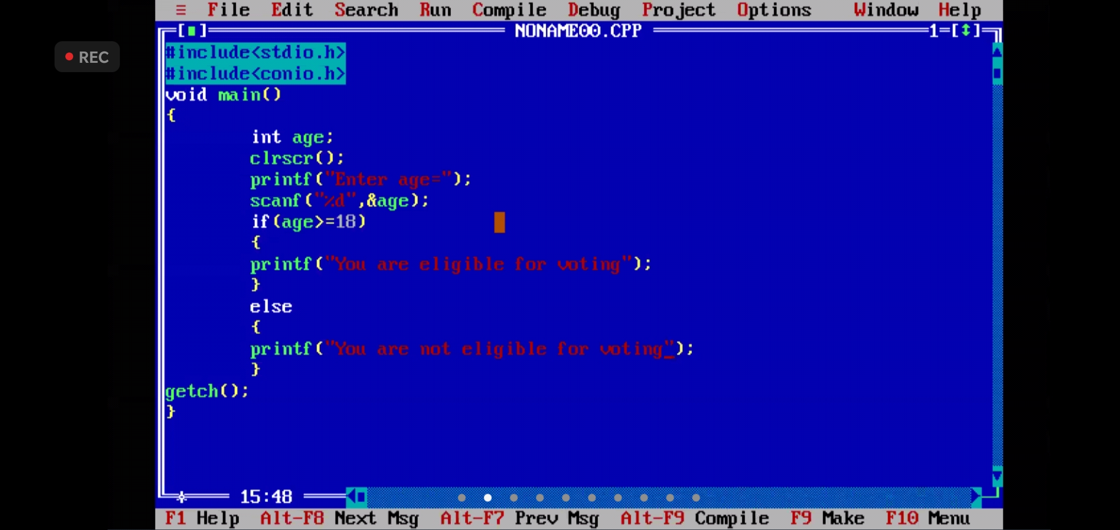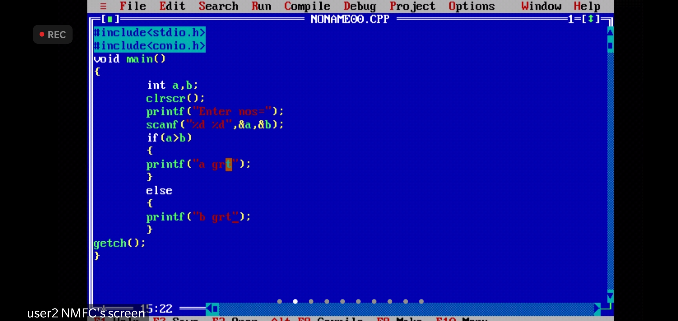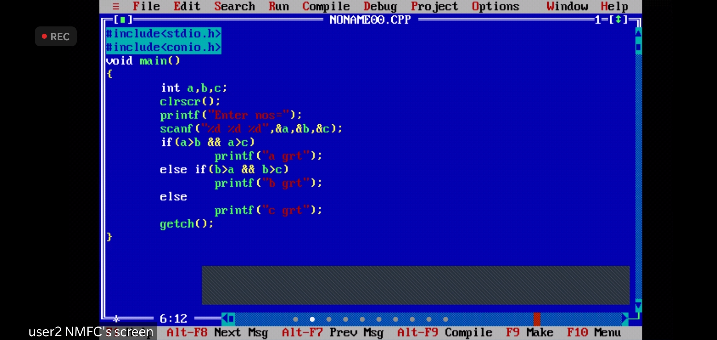 #include<stdio.h> #include<conio.h> void main() { int n1,n2,n3; clrscr(); printf("Enter numbers"); scanf("%d%d%d",&n1,&n2,&n3); if (n1 >= n2 && n1 >= n3) printf("%.2lf is the largest number.", n1); else if (n2 >= n1 && n2 >= n3) printf("%.2lf is the largest number.", n2); else printf("%.2lf is the largest number.", n3); return 0; }