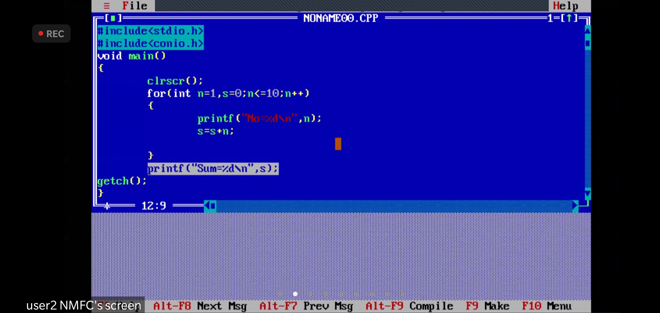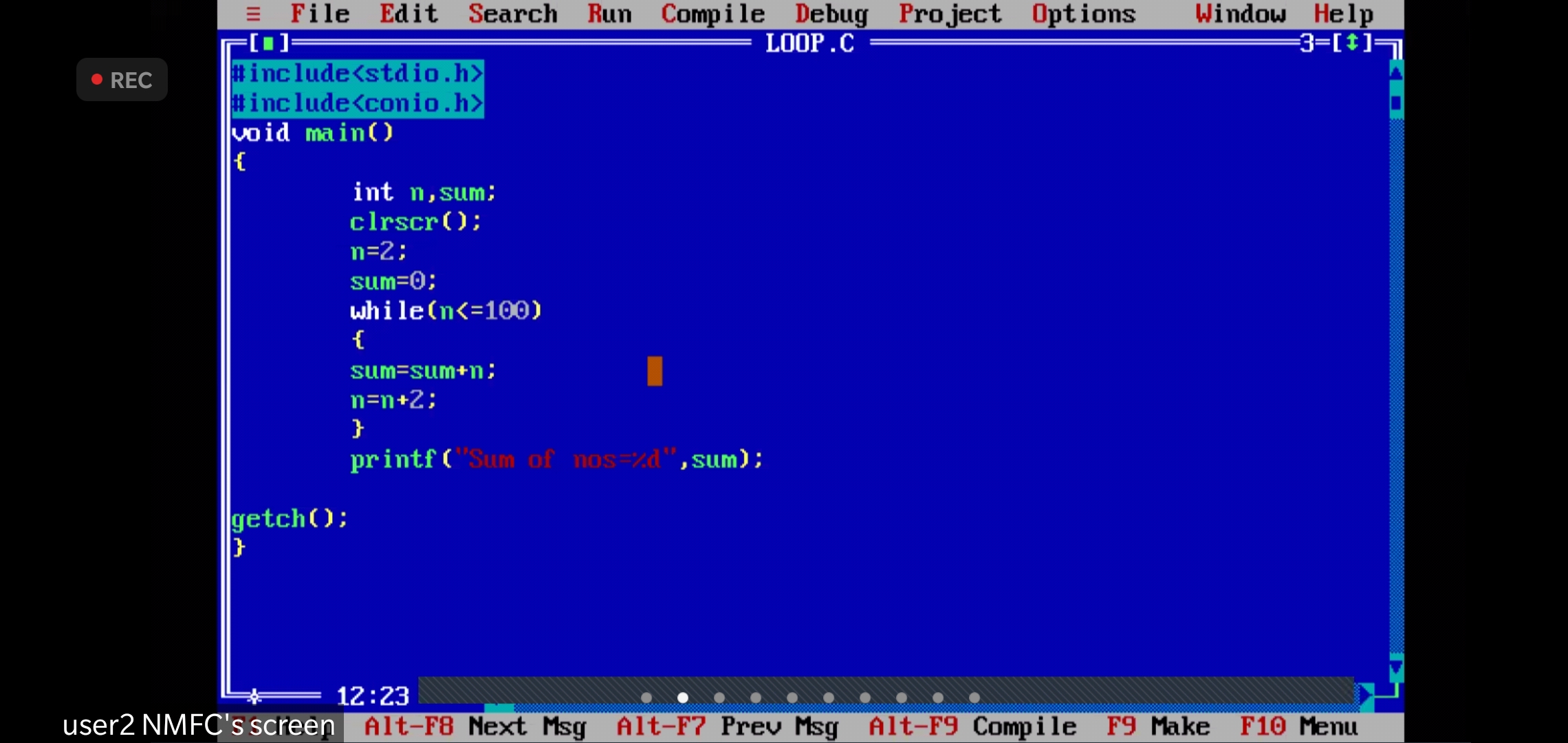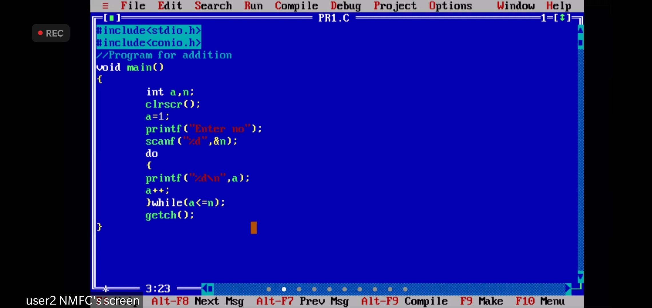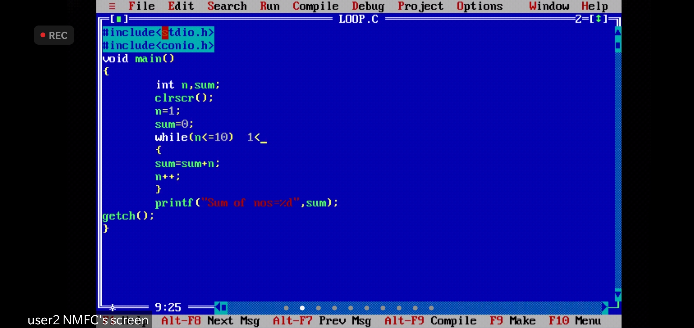 #include<stdio.h> #include<conio.h> void main() { int n,i,sum=0; printf("enter a number:") scanf("%d",&n); i=1; while(1<=n) { sum+1=i; ++i; } printf("sum=&d,",sum); }