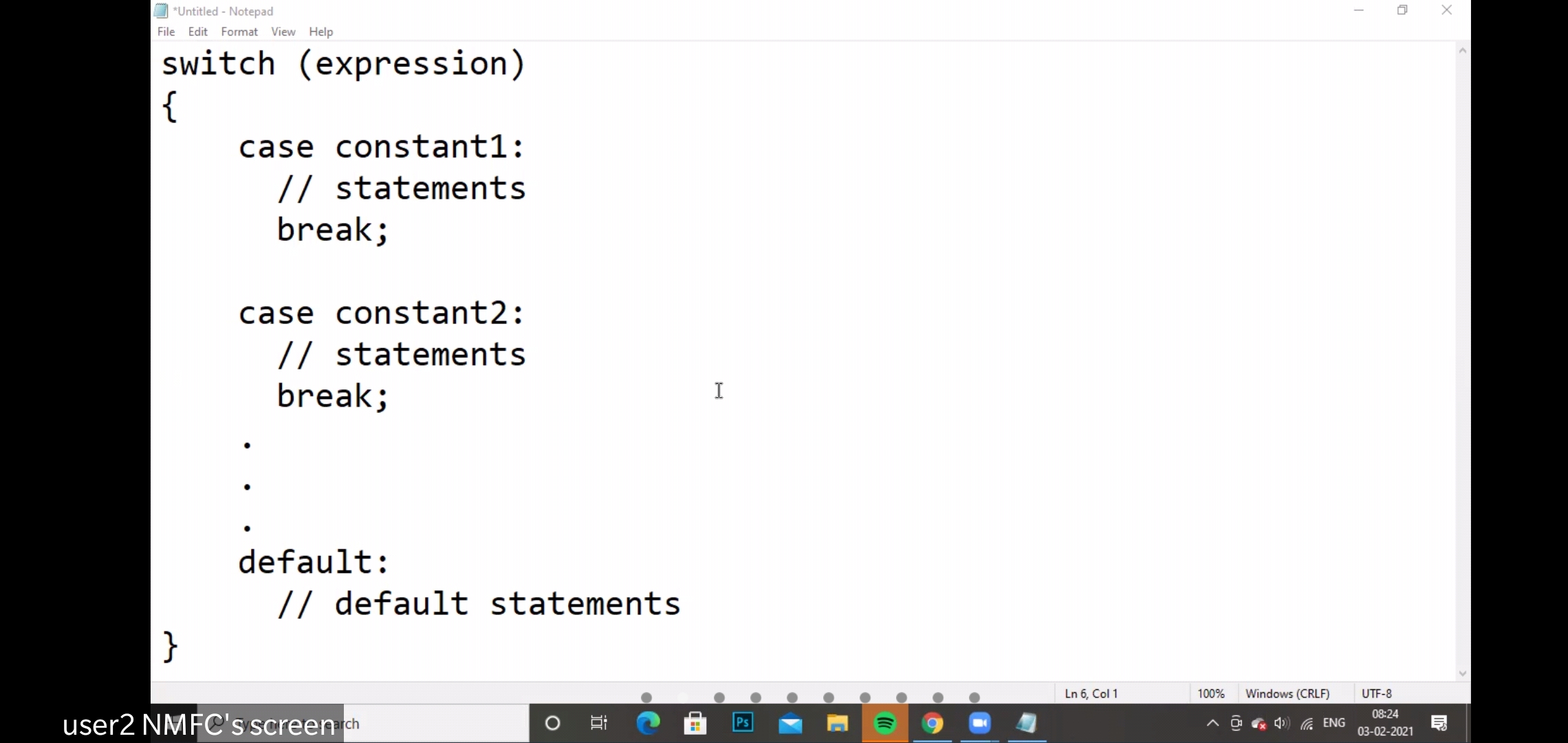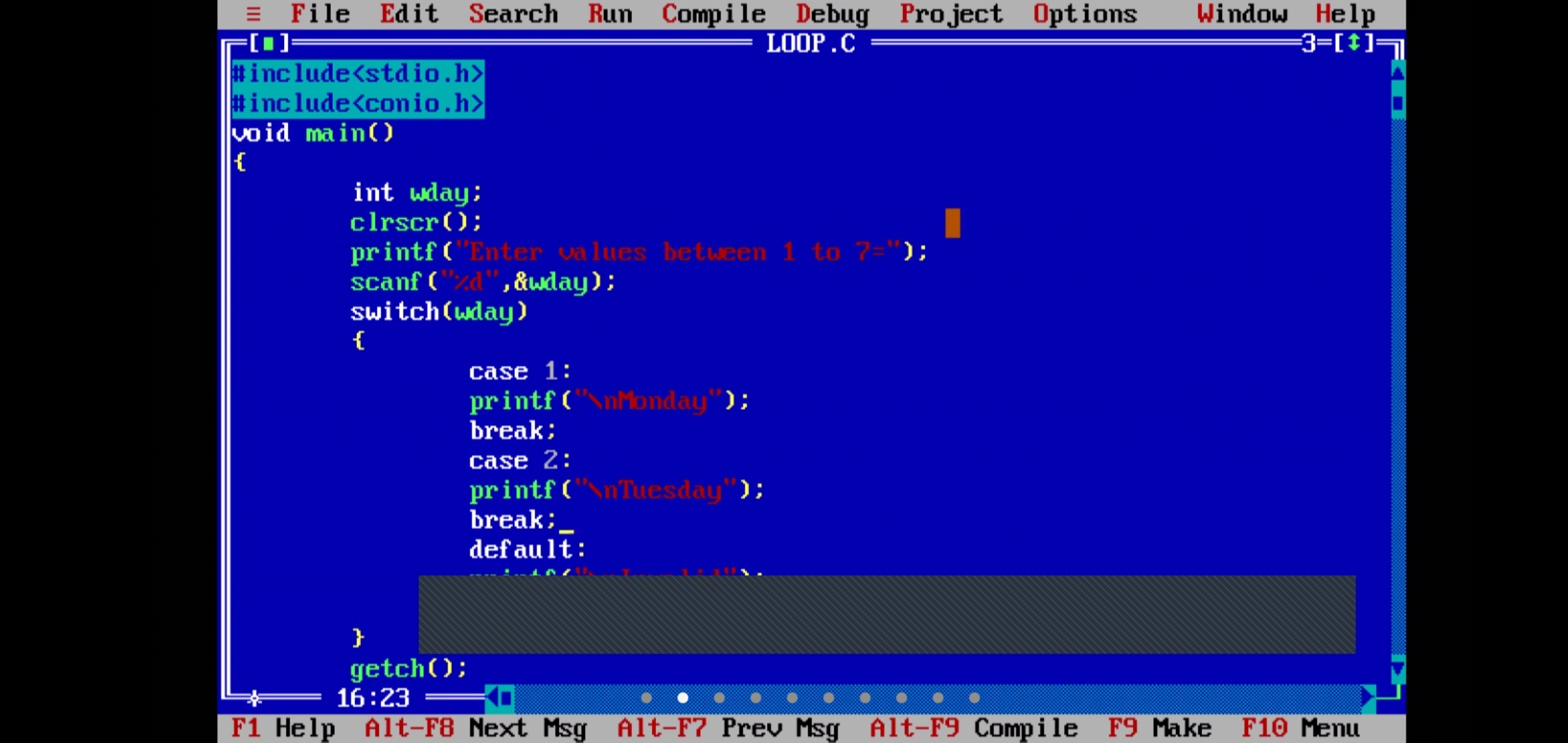#include <stdio.h> int main(). { int wday; /* Input week number from user */ printf("Enter week number(1-7): "); scanf("%d", &week); switch(wday) { case 1: printf("Monday"); break; case 2: printf("Tuesday"); break; case 3: printf("Wednesday"); break; case 4: printf("Thursday"); break; case 5: printf("Friday"); break; case 6: printf("Saturday"); break; case 7: printf("Sunday"); break; default: printf("Invalid input! Please enter week number between 1-7."); } return 0;}