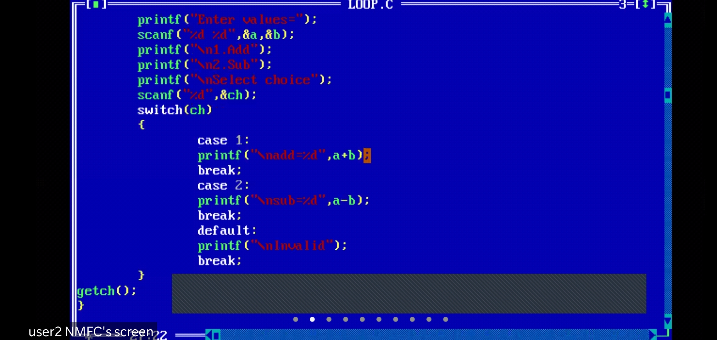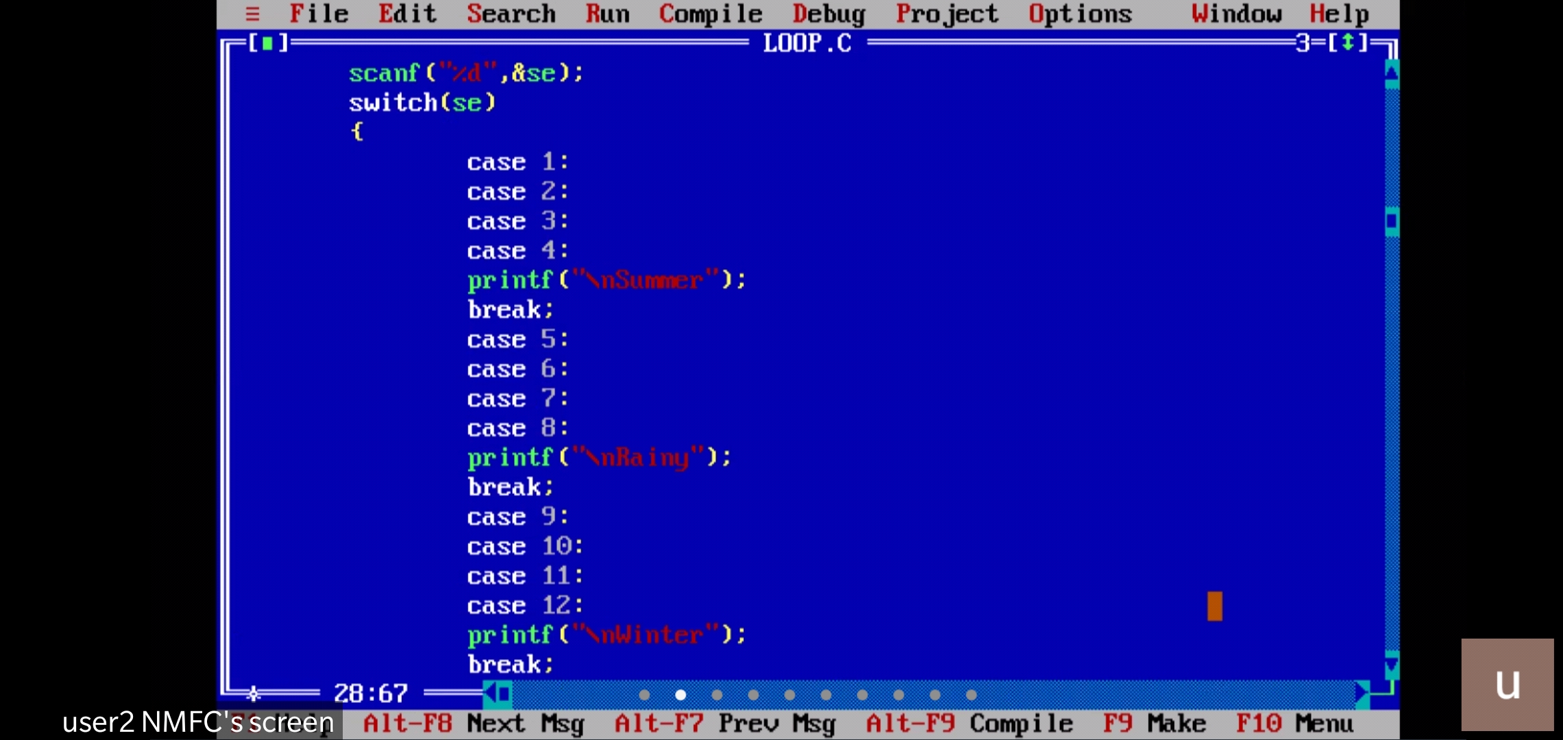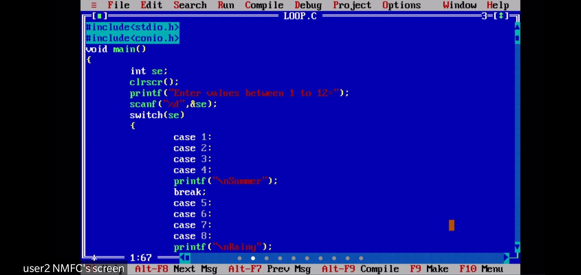 #include <stdio.h> int main(). { int month; /* Input week number from user */ printf("Enter week number(1-12): "); scanf("%d", &month); switch(month) { case 1: printf("January"); break; case 2: printf("February"); break; case 3: printf("March"); break; case 4: printf("April"); break; case 5: printf("May"); break; case 6: printf("June"); break; case 7: printf("July"); case 8: printf("August"); case 9: printf("September"); break; case 10: printf("October"); break; case 11: printf("November"); break; case 12: printf("December"): break; default: } getch() }