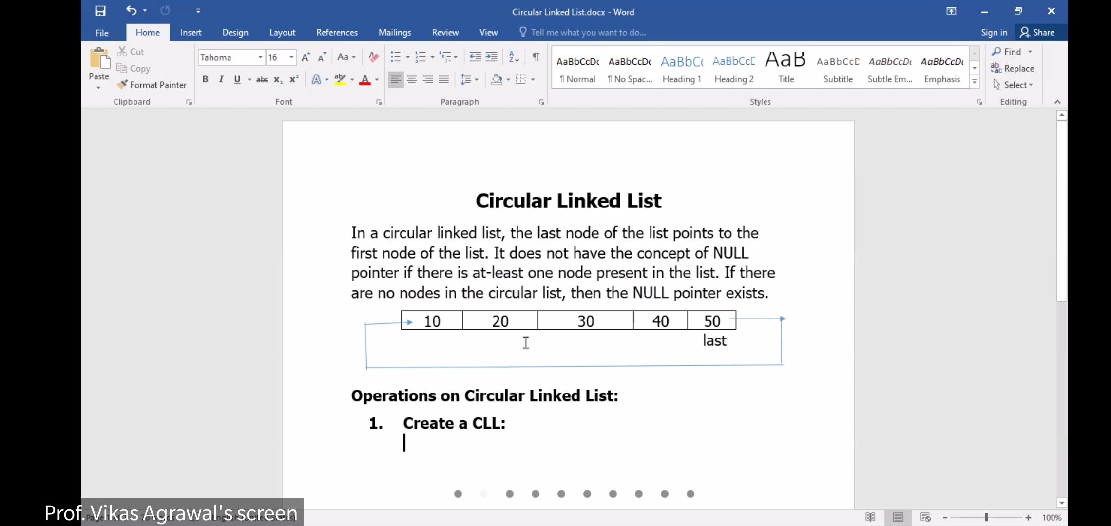 The CLL is similar to SLL, i.e each element points to its next element, while the last element points to the first element. In a CLL, if atleast 1 element is present, then there is no concept of NULL pointer.